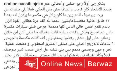 “بشكر ربي أولاً رجع خلقني وأعطاني عمر جديد. الانفجار كان قريب والمنظر مش متل الحكي فعلاً يلي بيفوت عالبيت وبيشوف الدم وين ما كان وكل شي مكسر ما بيقول انه بعدنا عايشين، الحمدالله الف مرة عطاني القوة انزل ٢٢ طابق حافية مغطسة بالدم تأقدر خلص حالي”.
