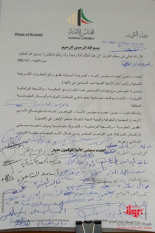 وذكر النواب في البيان: تلقينا نحن أعضاء مجلس الأمة المدرجة أسماؤنا بقلق بالغ الخطوات التشريعية التعسفية والإجراءات الأمنية القمعية ضد المسلمين في الهند، ونحن إذ نتضامن مع إخوائننا المسلمين هناك فإننا ندعو الحكومة والشعبة البرلمانية الكويتية لاتخاذ مواقف تضامنية عملية في المحافل الدولية والوسائل الدبلوماسية المختلفة.
