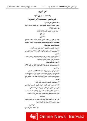 كما يضم المرسوم أن يشمل اختصاصات الأمير في شؤون مجلس الأمة وتعيين الموظفين المدنيين والعسكريين