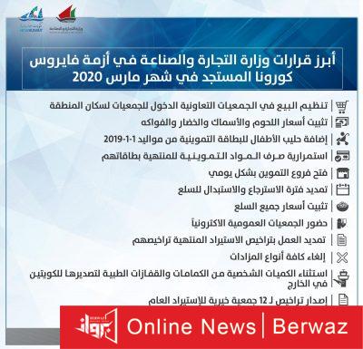 أعلنت وزارة التجارة والصناعة عن العديد من القرارات في إطار مواجهة أزمة فيروس كورونا المستجد خلال شهر مارس الماضي، وشملت تنظيم البيع في الجمعيات التعاونية ودخولها لسكان المنطقة، وتثبيت أسعار اللحوم والأسماك والخضار والفواكه، وإضافة حليب الأطفال للبطاقة التموينية لمواليد 1 يناير 2020، واستمرار صرف المواد التموينية للمنتهية بطاقاتهم، وفتح فروع التموين بشكل يومي.