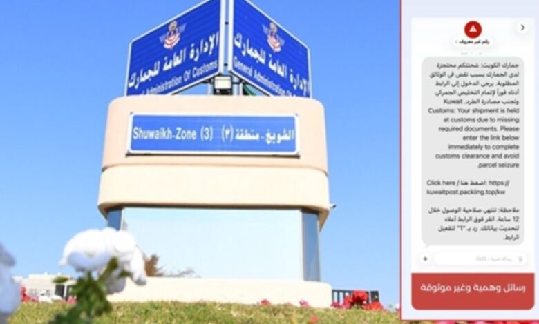 حذّرت الإدارة العامة للجمارك المواطنين والمقيمين من انتشار رسائل نصية ومواقع إلكترونية وهمية تنتحل صفتها، وتدّعي وجود شحنات محتجزة أو نقص في مستندات التخليص الجمركي، بهدف استدراج المتلقين للضغط على روابط غير موثوقة وتزويدها ببيانات شخصية أو بنكية.
