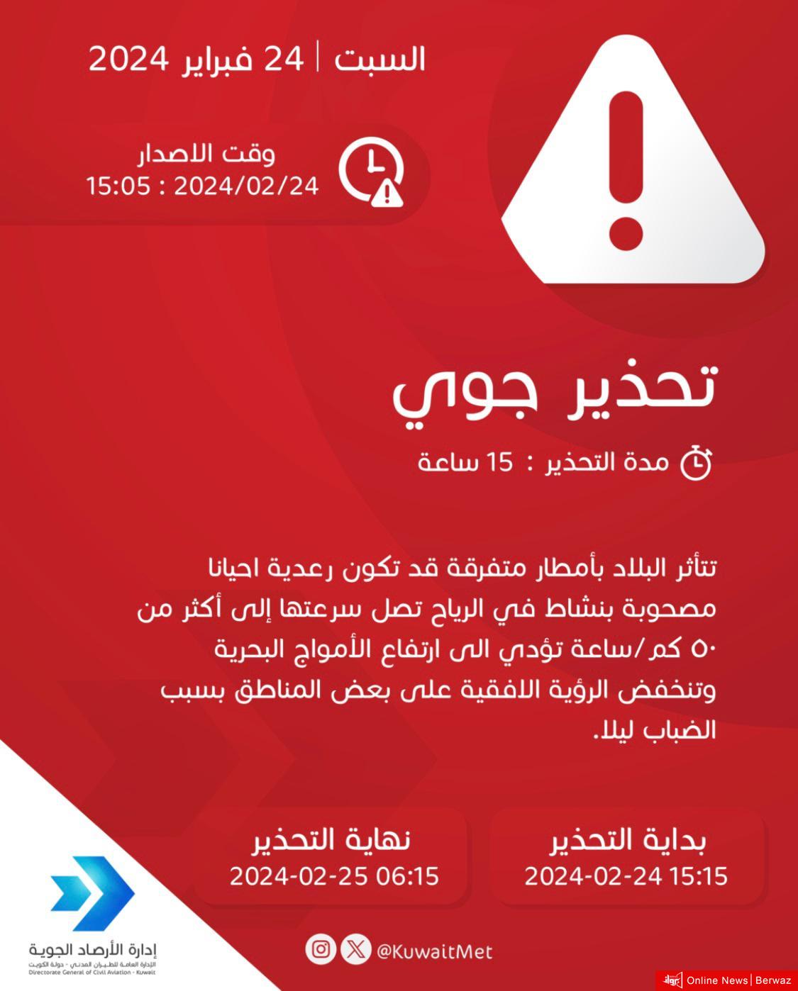كما نوهت إلى أن الرياح سوف تؤدي إلى إرتفاع الأمواج البحرية وهبوط الرؤية الأفقية على بعض المناطق بسبب الضباب ليلًا.