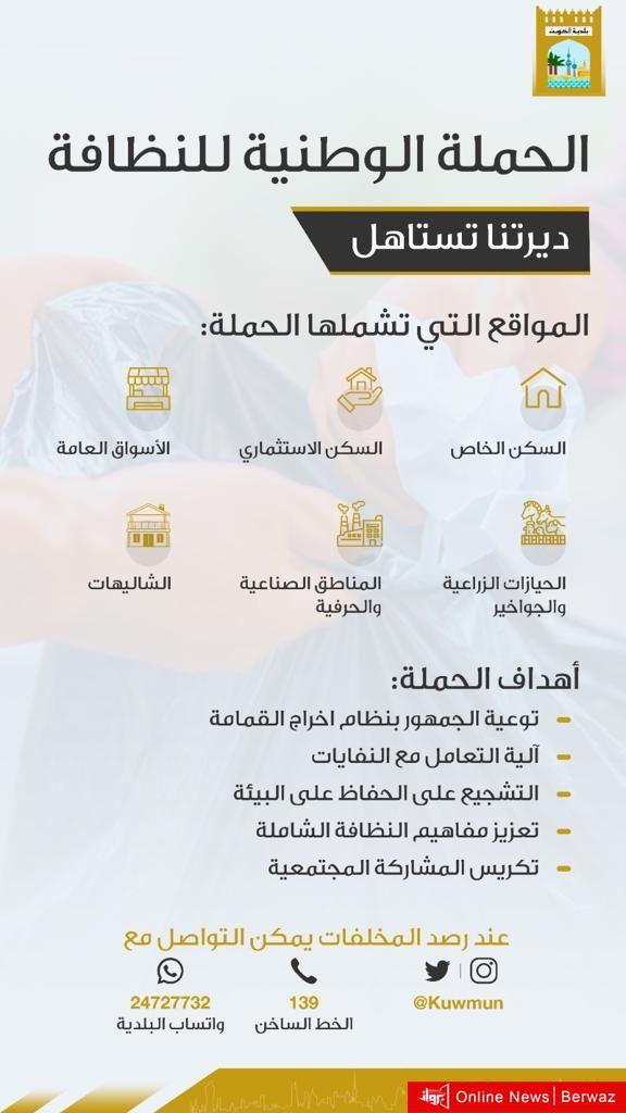 وبين ان الحملة تستهدف تكثيف اعمال النظافة لتشمل المناطق السكنية والاستثمارية والتجارية والاسواق العامة ومراقبة مستوى النظافة في المناطق الزراعية والشاليهات والجواخير وكذلك في المناطق الصناعية والحرفية .