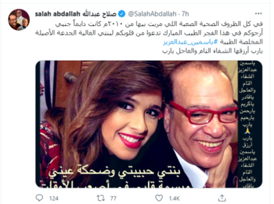 وكتب الفنان صلاح عبد الله عن ياسمين عبد العزيز في محنتها الصحية: في كل الظروف الصحية الصعبة اللي مريت بيها من 2010 كانت دايما جنبي.. أرجوكم تدعو من قلوبكم لبنتي الغالية الجدعة الأصيلة المخلصة الطيبة ياسمين عبد العزيز يا رب ارزقها الشفاء التام والعاجل يا رب، بنتى حبيبتى وضحكة عيني وبسمة قلبي في أصعب الأوقات ألف سلامة يا ياسميني يا دودى يا أجمل الجميلات.