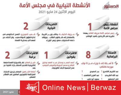 شهد مجلس الأمة الكويتى اليوم الإثنين الموافق 24 مايو 2021 العديد من الأنشطة النيابية، من تصريحات لأعضاء المجلس، واجتماعات اللجان، وتقديم الاقتراحات بقوانين وبرغبة، والأسئلة البرلمانية.