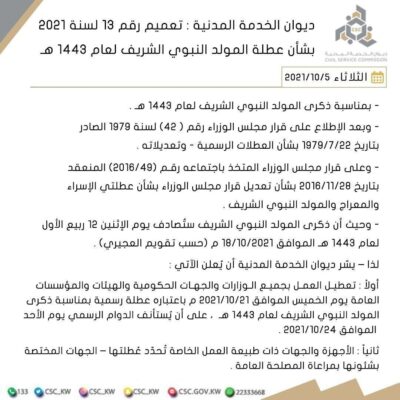 عمم ديوان الخدمة المدنية عطلة المولد النبوي الشريف للسنة الهجرية 1443 حسب التالي:
