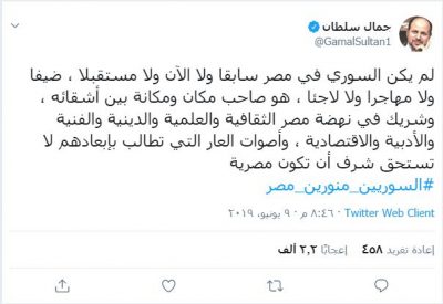 وعلّق الصحفي المصري جمال سلطان، رئيس تحرير جريدة المصريون، فقال: لم يكن السوري في مصر سابقًا ولا الآن ولا مستقبلًا ضيفًا ولا مهاجرًا ولا لاجئًا، هو صاحب مكان ومكانة بين أشقائه، وشريك في نهضة مصر الثقافية والعلمية والدينية والفنية والأدبية والاقتصادية، وأصوات «العار» التي تطالب بإبعادهم لا تستحق شرف أن تكون مصرية.