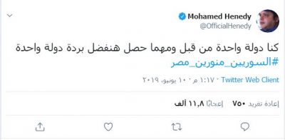 أما الكوميديان المصري محمد هنيدي، فلم يفوّت الفرصة دون أن يظهر حبه السورييين فغرد قائلًا: كنا دولة واحدة من قبل ومهما حصل هنفضل بردة دولة واحدة.