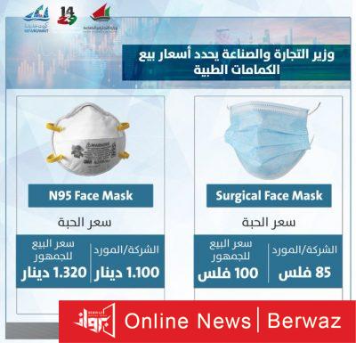 وحددت وزارة التجارة أسعار الكمامات بـ150 فلسا، مبررة قرارها بزيادة الطلب العالمي عليها وشح الكميات الموجودة في السوق المحلي وارتفاع أسعار المواد الأولية اللازمة لتصنيعها.