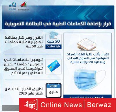 وأعلنت أنها ستضيف علبة كمامات تحتوي 50 حبة إلى البطاقة التموينية.