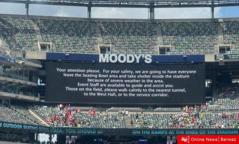وأصدرت شرطة نيوجيرسي تحذيرًا قالت فيه: “توقف المباراة بسبب ظروف طقس قاسي، ومطالبة اللاعبين بالدخول لغرفة الملابس، وخروج الجماهير للوقوف في ممرات المدرجات حرصًا ع سلامتهم وأمنهم”.