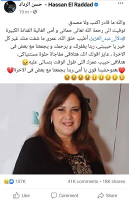 توفيت الى رحمة الله تعالى حماتى و أمى الغالية الفنانة الكبيرة #دلال_عبد_العزيز، أطيب خلق الله، عمرى ما شفت منك غير كل خير يا حبيبتى، ربنا يغفرلك و يرحمك و يجمعنا مع بعض فى الاخرة ، عايز اقولك انك هتلاقى مفاجاة حلوة مستنياكى، هتلاقى حبيب عمرك اللى طول الوقت بتسالى عليه، هتوحشينا قوى يا أمى،ربنا يجمعنا مع بعض فى الاخرة”.