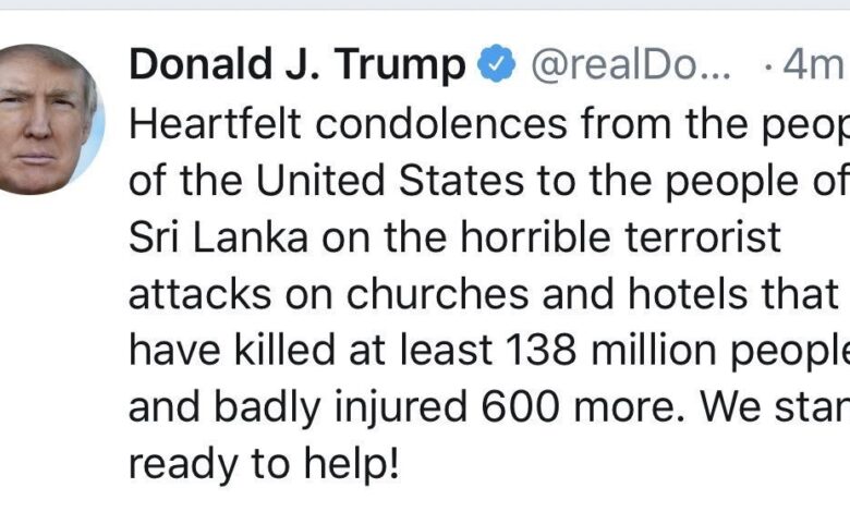 وقدم ترامب في تغريدته تعازيه لسريلانكا ولذوي الضحايا، الذين ناهز عددهم الـ200، لكنه قدم عددا غير منطقي لقتلى الهجمات، خيث نشر بالحرف الواحد: (تعازينا الحارة من الشعب الأمريكي لشعب سريلانكا، إثر الهجمات الإرهابية الرهيبة التي استهدفت كنائس وفنادق وأسفرت عن مقتل 138 مليون شخص على الأقل، وإصابة نحو 600 آخرين).