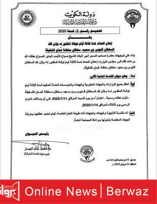 ومن جانبها صرحت وزارة التربية عن ترحيل اختباراتها ليومي الثلاثاء والأربعاء، بعد أمر صاحب السمو الأمير بإعلان الحداد الرسمي وتنكيس الأعلام وتعطيل جميع الدوائر الحكومية لمدة ثلاثة أيام اعتبارًا من اليوم حدادًا على وفاة المغفور له بأذن الله تعالى السلطان قابوس بن سعيد.