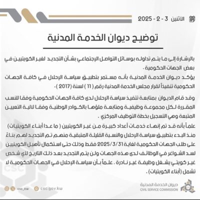 قال ديوان الخدمة المدنية أن سياسة الإحلال في الجهات الحكومية لا تشمل أبناء الكويتيات . وجاء في بيان الديوان: