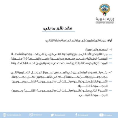 أعلنت وزارة التربية إعتماد قواعد عودة المتعلمين إلى المدارس مطلع العام الدراسي 2021-2022 من خلال تقسيم الفصل إلى مجموعتين بواقع 5 أيام في الأسبوعين لكل مجموعة.