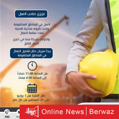 كما لفت إلى أن القرار يستهدف حماية العمالة من حرارة الطقس الشديدة خلال تلك الفترة من الساعة الحادية عشرة صباحًا وحتى الرابعة عصرًا.