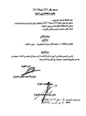 صدر رسمياً، صباح اليوم، مرسوم أميري بقبول استقالة الوزير نايف الحجرف من حقيبة وزارة المالية، كما صدر مرسوم آخر بتعيين مريم العقيل وزيرة للمالية بالوكالة.