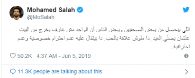 لكن تجمهر العشرات من أبناء البلدة أمام منزل عائلة صلاح لالتقاط الصور معه، حرمه من تأدية الصلاة، فكتب في حسابه الرسمي على موقع “تويتر”: “اللي بيحصل من بعض الصحفيين وبعض الناس أن الواحد مش عارف يخرج من البيت علشان يصلي العيد. دا ملوش علاقة بالحب. دا بيتقال عليه عدم احترام خصوصية وعدم احترافية”.
