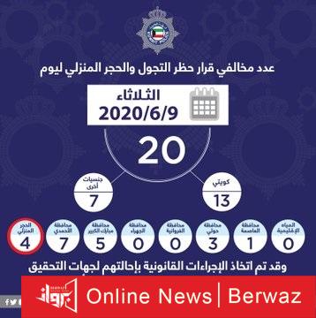 أعلنت وزارة الداخلية، اليوم الأربعاء، إن عدد المخالفين لقرار حظر التجول الشامل والحجر المنزلي، أمس الثلاثاء، بلغ 20 مخالف، 13 مواطن و7 من جنسيات أخرى، وفيما يلي تفاصيل توزيع المخالفين طبقًا للمحافظات.