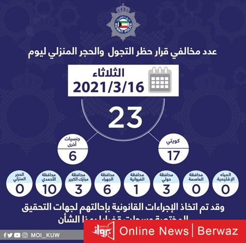 أفصحت وزارة الداخلية عن ضبط 23 مخالف لقانون حظر التجول، أمس الثلاثاء، بواقع 17 كويتيًا و6 من جنسيات أخرى.