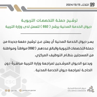 أعلن ديوان الخدمة عن ترشيح 692 من حملة التخصصات التربوية للعمل لدى وزارة التربية.