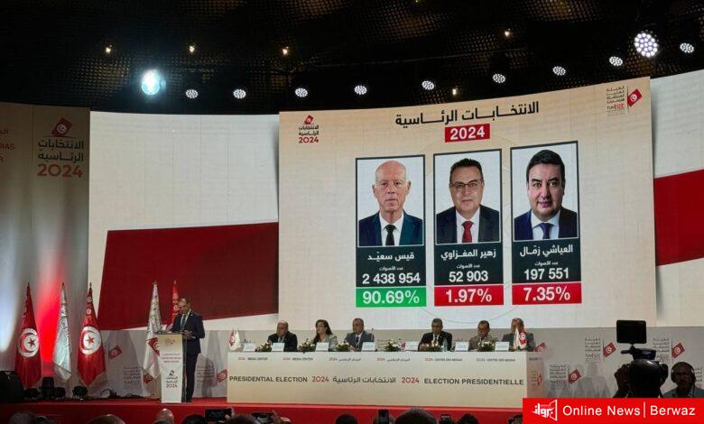 وأضافت الهيئة، في بيان لها، أن المترشح قيس سعيد تحصل على 90.69%، فيما تحصل منافسه العياشي زمال على 7.35% من الأصوات، أما المترشح الثالث زهير المغزاوي فقد تحصل على 1.79% من أصوات المقترعين.