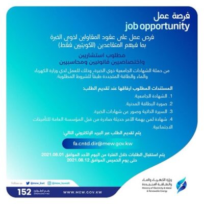 فرص عمل بوزارة الكهرباء على عقود المقاولين شرط كويتي الجنسية