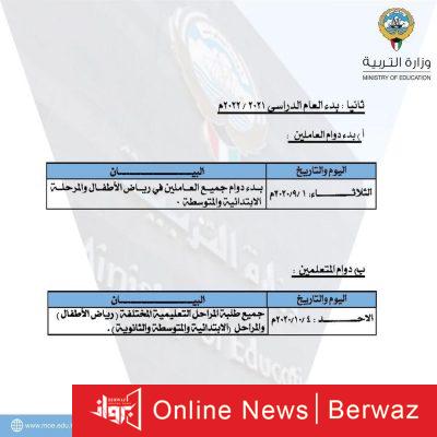 فيما لفتت وزارة التربية، إلى أن دوام جميع العاملين في المرحلة الثانوية والوظائف الإشرافية والهيئة التعليمية والإدارية سيكون في المدارس، وكذلك الموجهين الفنيين، مع الإلتزام بالإجراءات الوقائية والصحية والنسب المقدرة من ديوان الخدمة المدنية حسب كل مرحلة من المراحل الخمسة للعودة التدريجية للحياة الطبيعية.