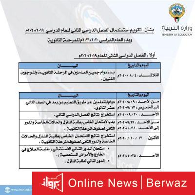 فيما لفتت وزارة التربية، إلى أن دوام جميع العاملين في المرحلة الثانوية والوظائف الإشرافية والهيئة التعليمية والإدارية سيكون في المدارس، وكذلك الموجهين الفنيين، مع الإلتزام بالإجراءات الوقائية والصحية والنسب المقدرة من ديوان الخدمة المدنية حسب كل مرحلة من المراحل الخمسة للعودة التدريجية للحياة الطبيعية.