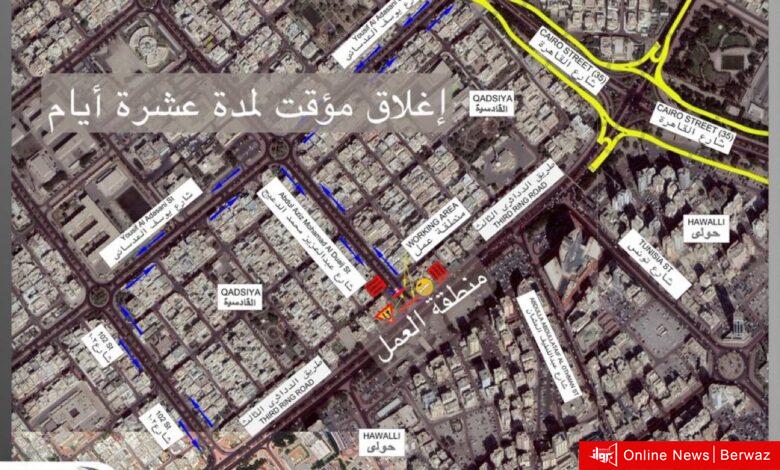 أفصحت الهيئة العامة للطرق والنقل البرى بالتعاون مع الإدارة العامة للمرور عن قرار إغلاق مؤقت لمدة 10 أيام لمدخل ومخرج شارع عبدالعزيز محمد الدعيج على طريق الدائرى الثالث بمنطقة القادسية واستخدام مدخل ومخرج شارع 102 كبديل مؤقت وذلك لعمل خطوط المياه النهائيه بالشارع بداية من الخميس الموافق 2023/9/28.