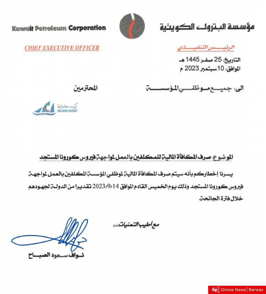 أفصحت مؤسسة البترول الكويتية عن تعميم رسمي حول صرف المكافأة المالية للمكلفين بالعمل لمواجهة فيروس كورونا المستجد.
