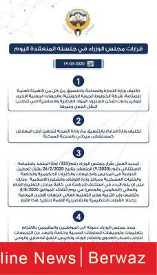 أصدر مجلس الوزراء في جلسته المنعقدة اليوم الخميس مجموعة من القرارات في ظل الظروف الطارئة التي تمر بها البلاد بسبب تفشي فيروس كورونا الجديد.