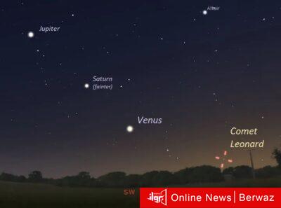 كشف معهد الفلك عن مرور المذنب ليونارد غدًا الأحد 12 ديسمبر على بعد حوالي 34 مليون كيلومتر من الأرض، ثم بعد ستة أيام – في 18 ديسمبر – سيكون المذنب أقرب بشكل استثنائي من كوكب الزهرة وعلى مسافة 4.2 مليون كيلومتر منه.