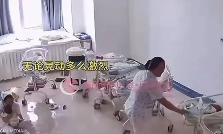 وإحدى الممرضتين ظهرت وهي تُسحب على الأرض بسبب شدة الهزة لكنها لم تترك الطفل من بين ذراعيها.