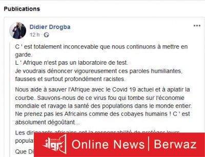 هذا وشارك الفيل الإيفواري ديدي دروغبا عبر صفحته الرسمية في الفيسبوك منشورا غاضبا، هاجم فيه الطبيب الفرنسي وكل المسؤولين الذين يرون إفريقيا كحقل تجارب منددا بالخرجة العنصرية المقيتة.