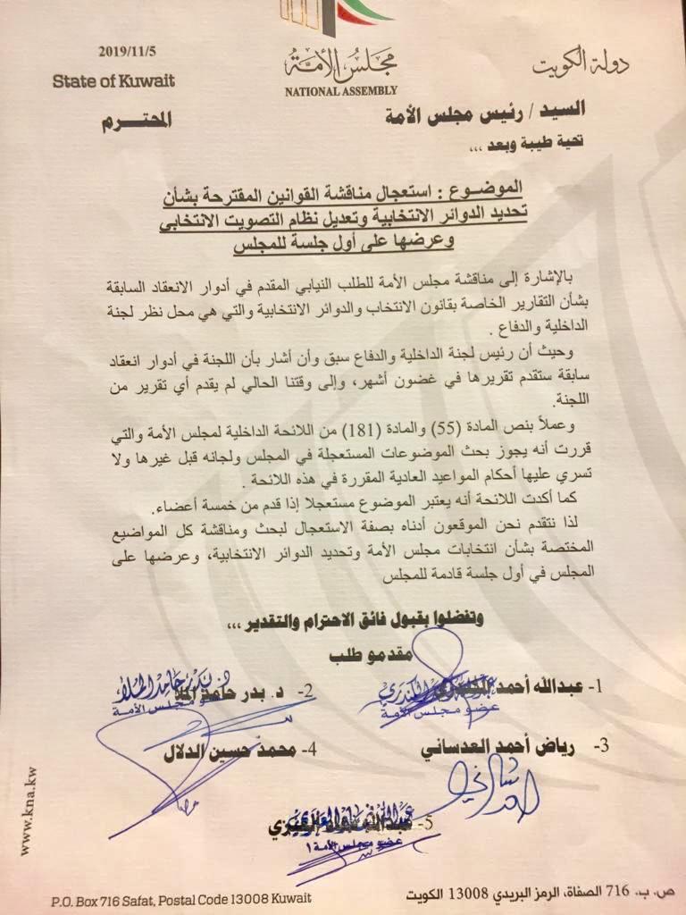 لذا نتقدم بصفة الاستعجال لبحث ومناقشة كل المواضيع المختصة بشأن إنتخابات مجلس الأمة وتحديد الدوائر الإنتخابية، وعرضها على المجلس في أول جلسة قادمة للمجلس.
