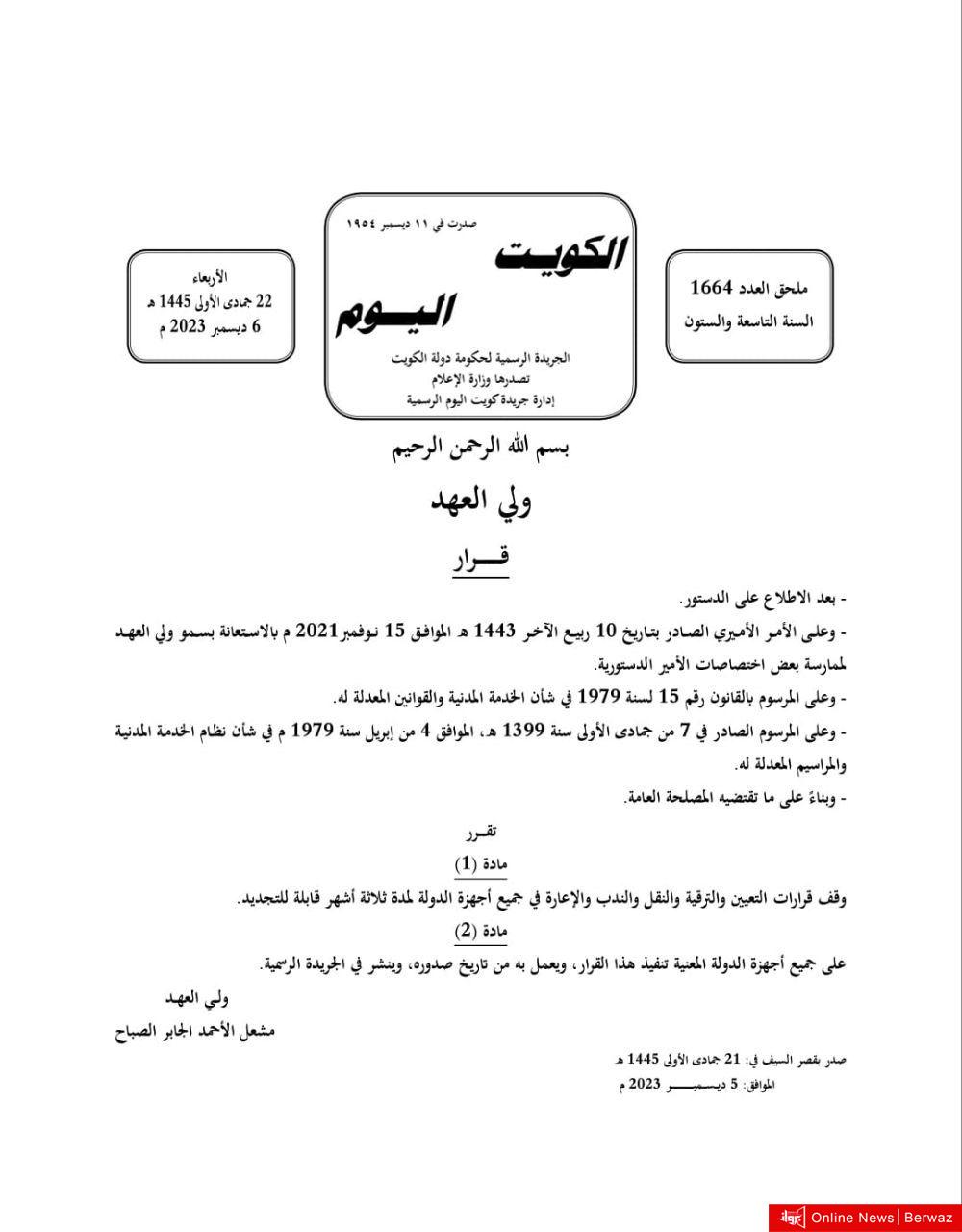 أفصح سمو ولي العهد الشيخ مشعل الأحمد، اليوم، عن قرار أميري جديد يتم بموجبه وقف الندب والتعيين والنقل لمدة 3 أشهر قابلة للتجديد.