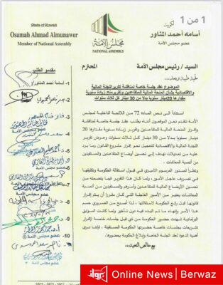 تقدم 10 نواب من أعضاء مجلس الأمة بطلب عقد جلسة خاصة لمناقشة تقرير اللجنة المالية والاقتصادية بشأن المنحة المالية للمتقاعدين الـ 3000 دينارًا، وتقرير منح زيادة سنوية مقدارها 20 دينار سنويًا بدلًا من 30 دينار كل ثلاث سنوات استنادًا إلى نص المادة 72 مـن اللائحة الداخلية لمجلس الأمة.