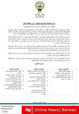 أعلن 48 نائبًا بمجلس الأمة على الاتفاق على خارطة تشريعية نيابية لدور الانعقاد الثاني تتضمن 18 أولوية لتحقيق تطلعات الشعب الكويتي، متمسكين بكل ما يحقق مصالحه ورفاهيته من خلال إعداد مجموعة من التشريعات الواقعية في مجالات مختلفة، مؤكدين في الوقت ذاته على حقه في فرض رقابته الحقيقية على السلطة التنفيذية عبر نوابه.