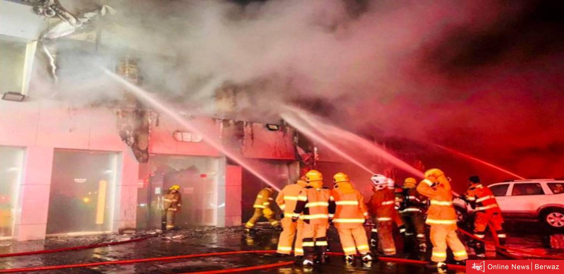 7 فرق إطفاء تعمل علي إخماد حريق ضخم في معرض أدوات صحية بالشويخ الصناعية