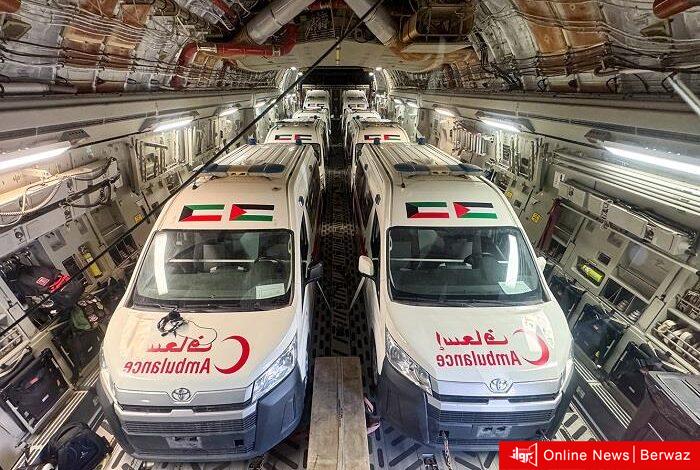 8 سيارات إسعاف مهداة من وزارة الصحة الكويتية إلى قطاع غزة على متن الطائرة الـ 26 من الجسر الجوي