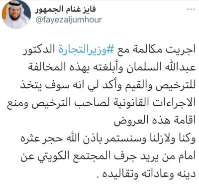 والذي أكد اتصاله بوزير التجارة من أجل إلغاء العرض بشكل رسمي ومخالفة صاحبه.