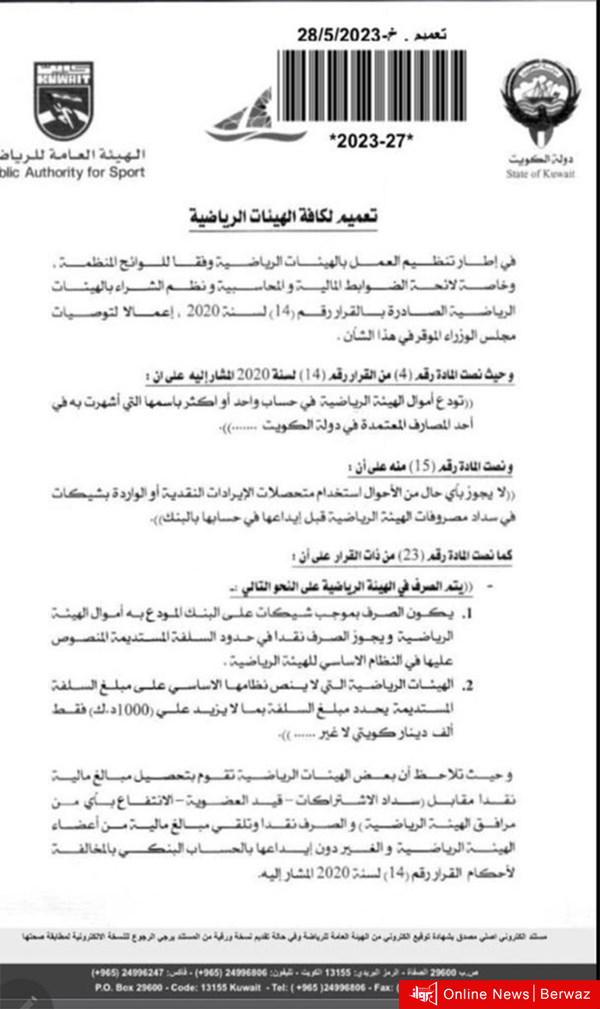 وتضمن التعميم التقيد بأحكام القرار رقم 14 لسنة 2020 بعدم الصرف نقدًا فيما يزيد على السلفة المستديمة المنصوص عليها بالنظام الأساسي أو فيما يزيد على 1000 دينار.
