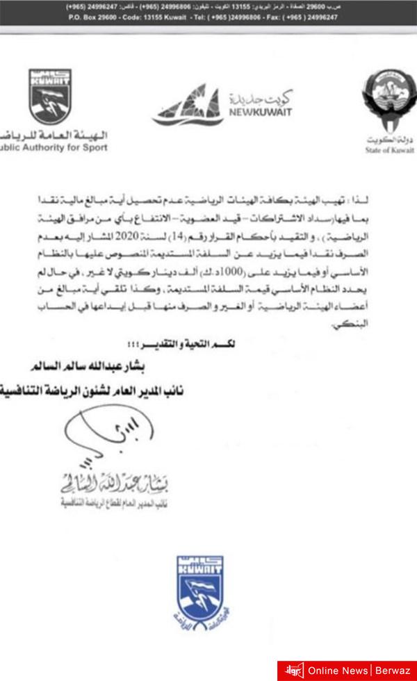 أفصح نائب المدير العام لشؤون الرياضة التنافسية بشار السالم عن تعميم جديد لجميع الهيئات الرياضية يتم بموجبه عدم تحصيل أية مبالغ مالية نقدًا، حتى وإن كان سداد الاشتراكات وقيد العضوية ومقابل الإنتفاع بأي من مرافق الهيئة الرياضية.