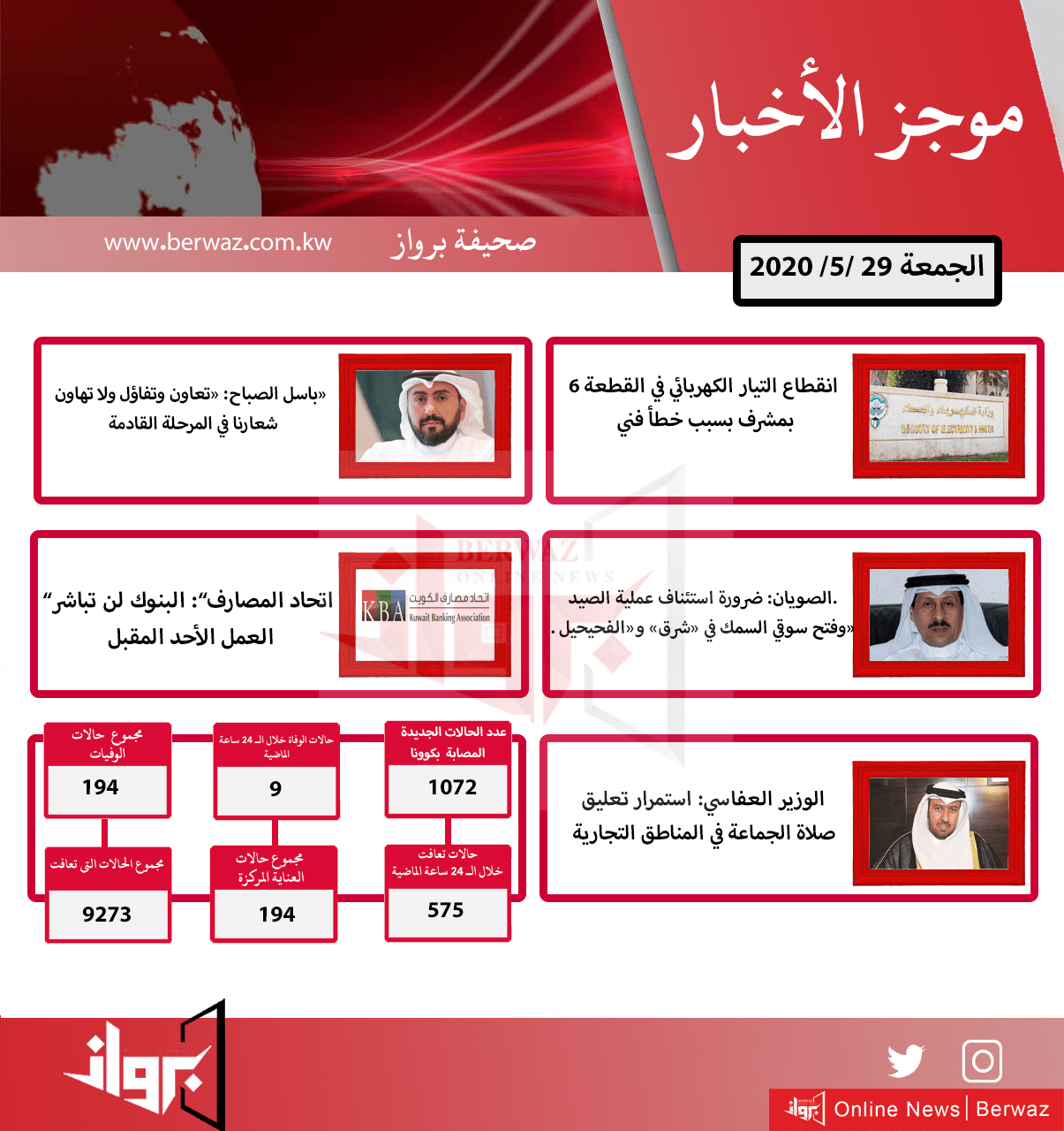 الوزير العفاسي: استمرار تعليق صلاة الجماعة في المناطق التجارية https://www.berwaz.com.kw/57379/ انقطاع التيار الكهربائي في القطعة 6 بمشرف بسبب خطأ فني…