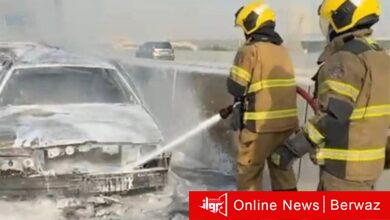 إصابة 3 أشخاص في تصادم مروع وحريق مركبتين على طريق الجهراء