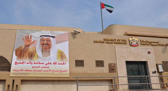 سفارة الامارات تتزين بصورة سمو الأمير احتفالا بعودته إلى البلاد