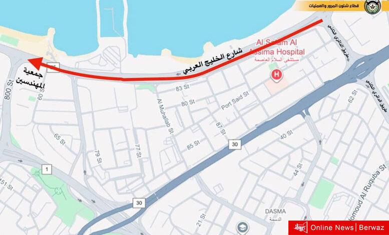 أعلنت الإدارة العامة للمرور عن إغلاق الحارة اليسرى ونصف الحارة الوسطى على شارع الخليج العربي، وذلك في الجزء الممتد من تقاطع طريق الدائري الثاني مع شارع الخليج العربي وحتى تقاطع جمعية المهندسين، اعتبارًا من يوم الأحد الموافق 4 يناير 2026 الساعة السادسة مساءً وحتى يوم الثلاثاء الموافق 6 يناير 2026 الساعة السادسة مساءً، ضمن أعمال الصيانة الجارية للطريق.